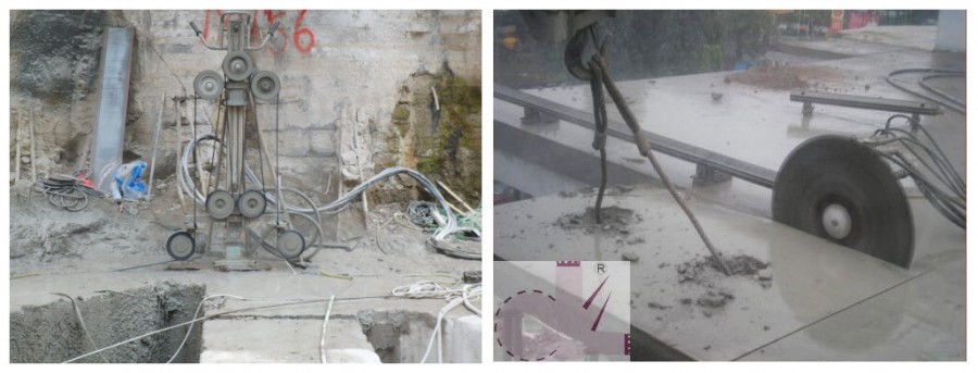對(duì)于原鋼筋混凝土結(jié)構(gòu),采用金剛石圓盤鋸片切割,將原混凝土完全去除,分段、分塊進(jìn)行作業(yè),切割切割時(shí)控制深度,不切割原始結(jié)構(gòu)。對(duì)于原有復(fù)雜的混凝土結(jié)構(gòu),采用金剛石線鋸切割和金剛石桶鋸鉆孔機(jī)鉆孔切割相結(jié)合的方式。