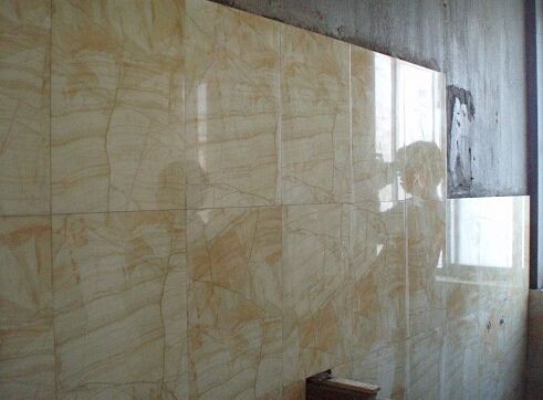 4.接下來,按要求拉標記線,確保瓷磚在同一平面上。瓷磚背面抹上水泥砂漿,用橡皮錘敲在墻上,然后用同樣的方法在指定的水平線粘貼瓷磚,保證穩(wěn)定。