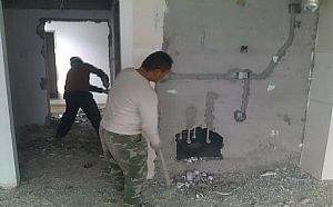 室內裝修拆除方法依拆除部位不同而有不同的拆除方法。對外墻裝飾的拆除需要做好必要的 施工準備,其拆除方向應為自上而下,進行逐層拆除,拆除前,要將本層外架進行一定的全封閉處理,外架立面掛鋼絲網后,再滿掛草墊,外架操作層需要滿鋪鋼腳手板至墻邊,下掛兜網,并在上面滿鋪上草墊,以防止碎片落入下方。具體的施工方法是 采用鏨子、手錘和電鏟等小型工具對外墻瓷磚或石材進行人工拆除,使用手錘呈豎直方向對墻面面層進行拆除,嚴禁與墻體呈垂直角度實施拆除,以免損壞原結構墻體。被拆除的混凝土塊,要統一從垃圾運輸通道運輸至首層,嚴禁在架子和腳手板等臨時支撐和原結構板上堆放垃圾。
