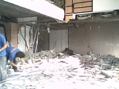 (1)中隔離墻的拆除:在室內搭好一簡易腳手架用榔頭或風鎬對墻體實施粉碎性拆除。