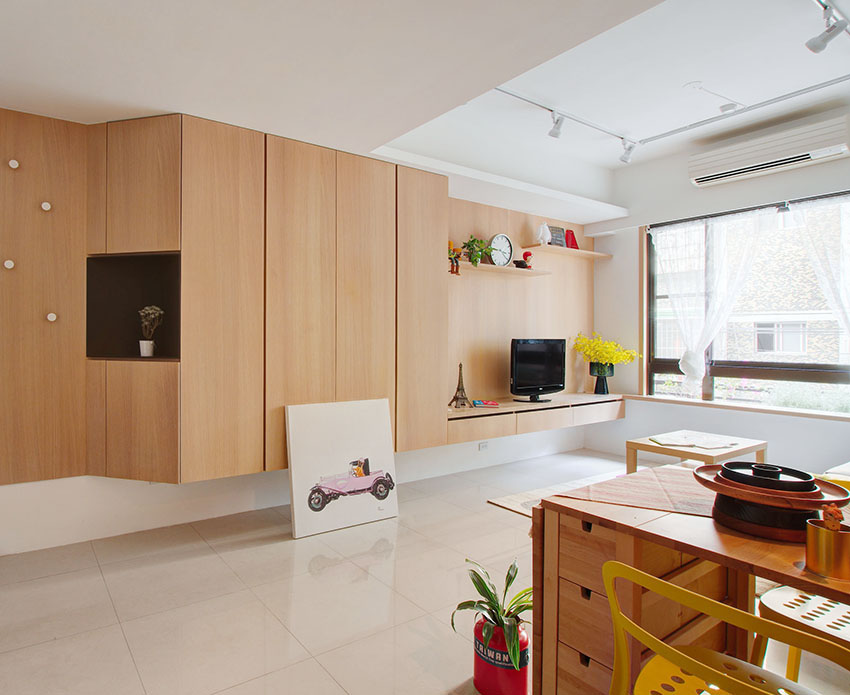 如果廚房外的區域也有一個小陽臺,那么不妨在陽臺的角落放置一個純粹清理外表的儲物柜,存放一些不常用的物品。也可以將清洗拖布、晾曬衣物的家務移到這里來進行,這樣就算廚房與衛生間面積偏小,為了日常的清潔工作,也不必在廚房里放一個與設計風格徹底不搭界的清洗盆了。